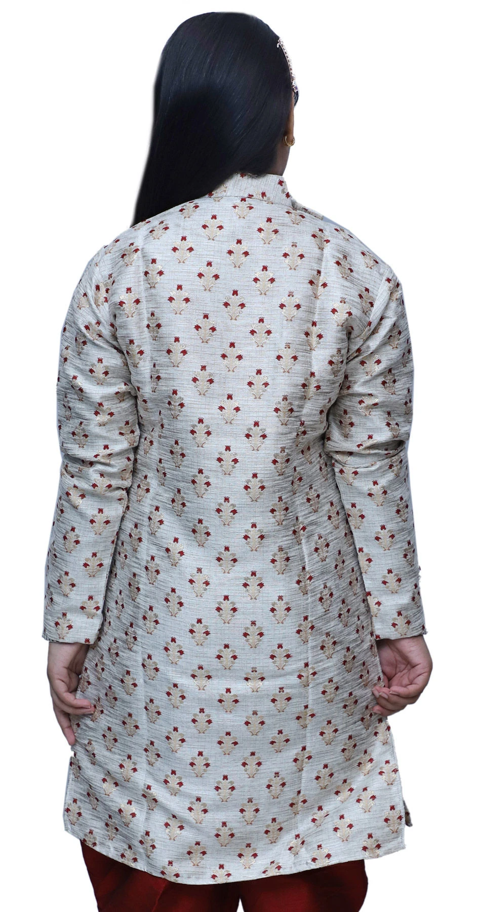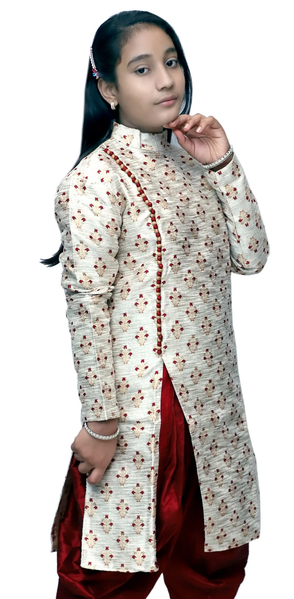 Brocade Girls Dress In Beige And Brown With Weaving Work