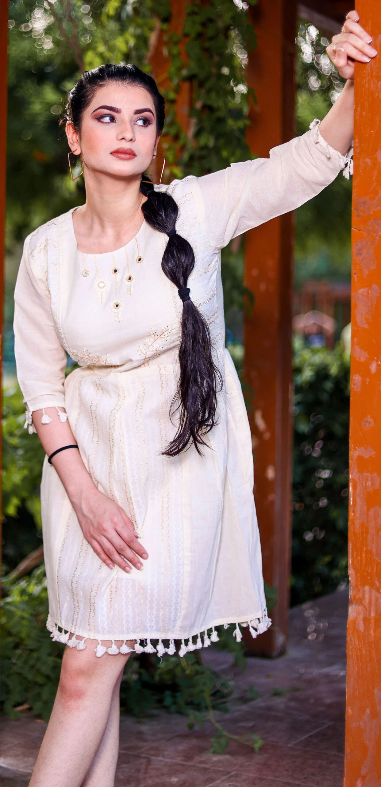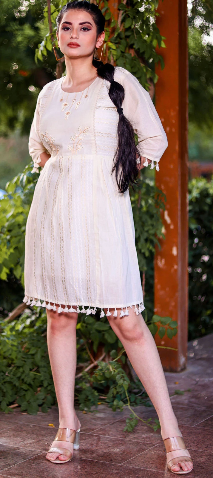 White and Off White color Dress in Cotton fabric with Embroidered, Mirror, Resham, Thread work
