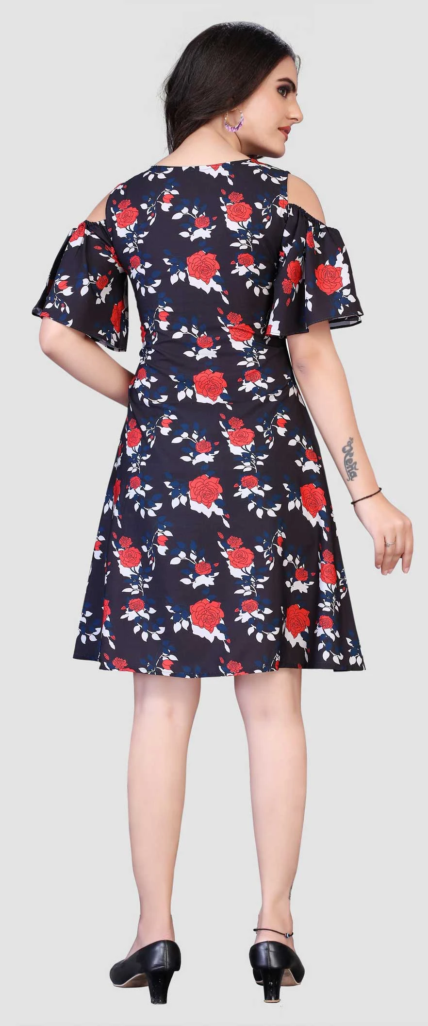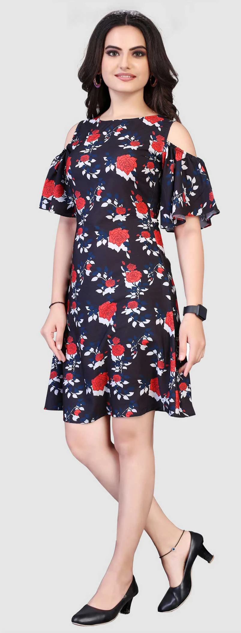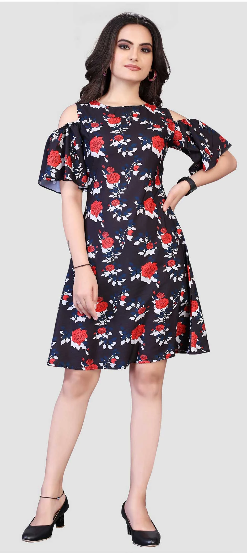 Black and Grey color Dress in Crepe Silk fabric with Floral, Printed work
