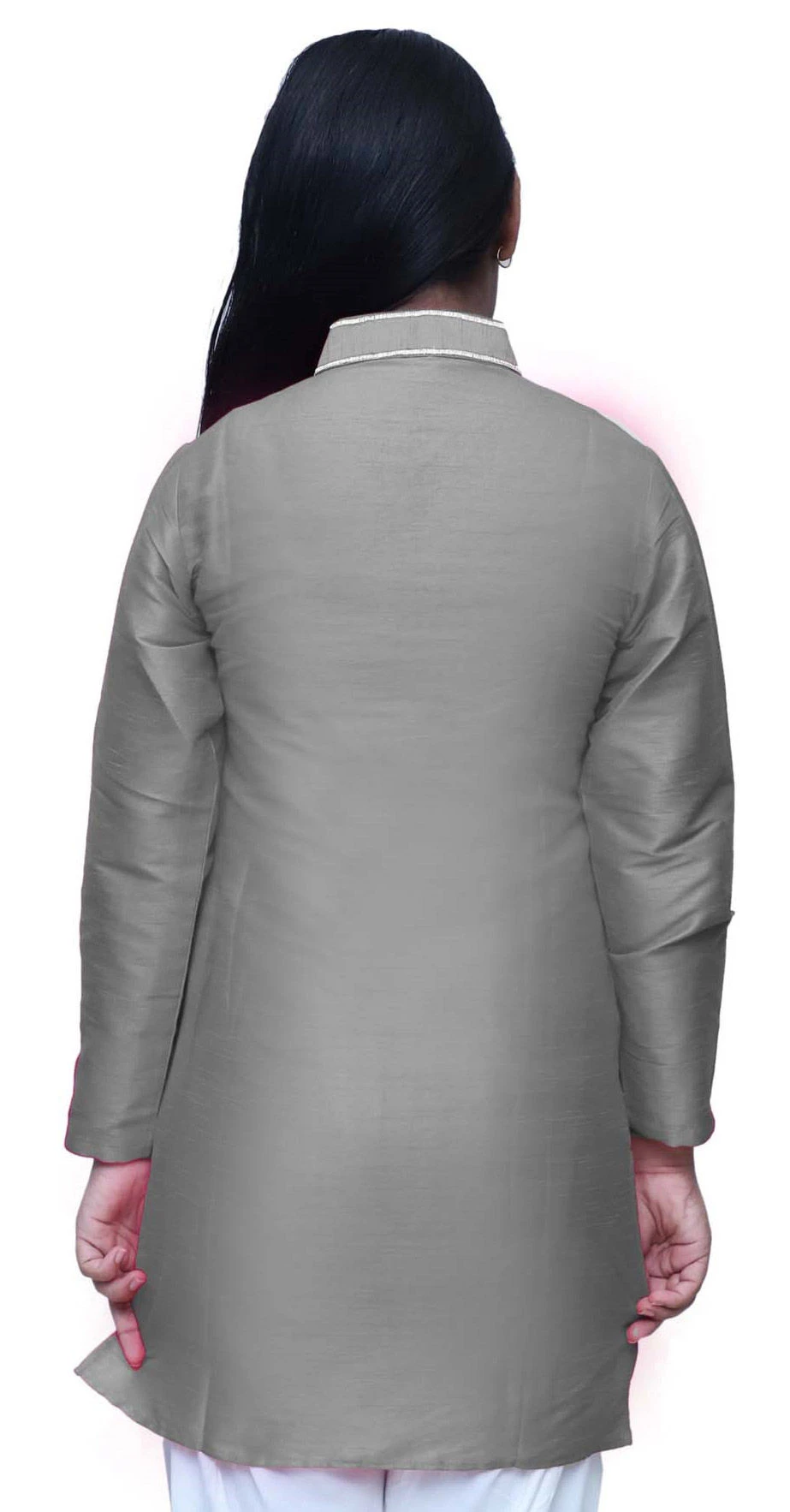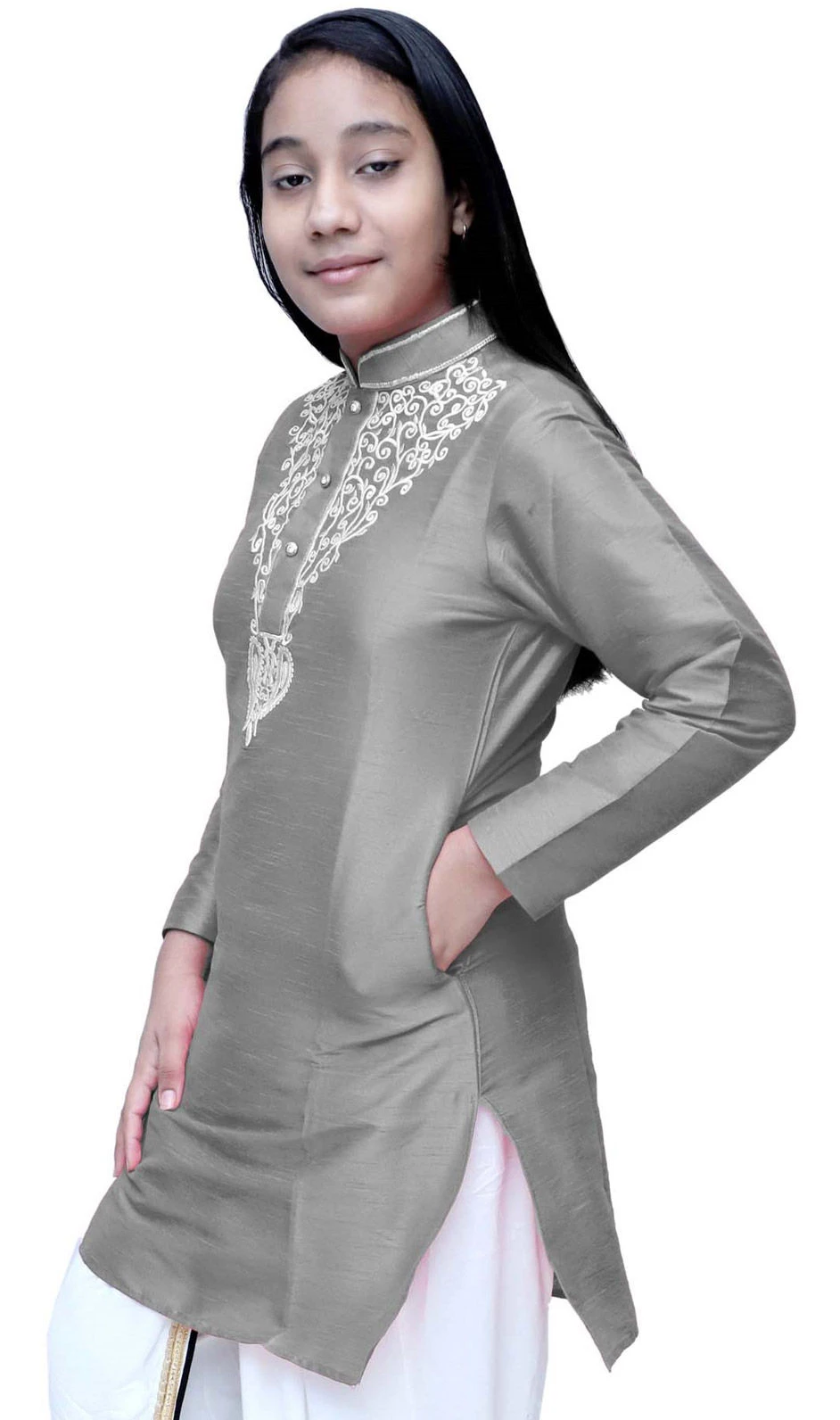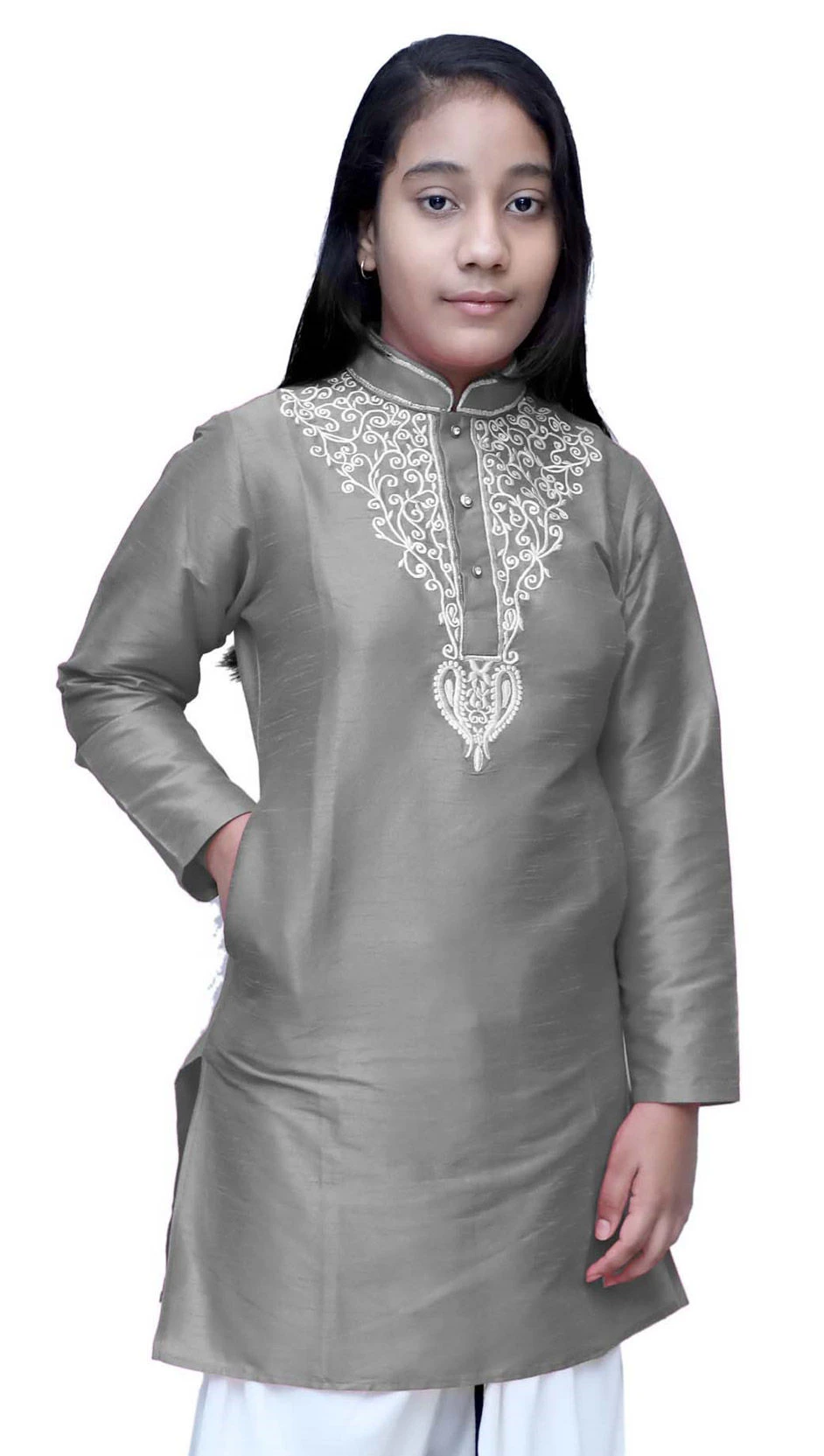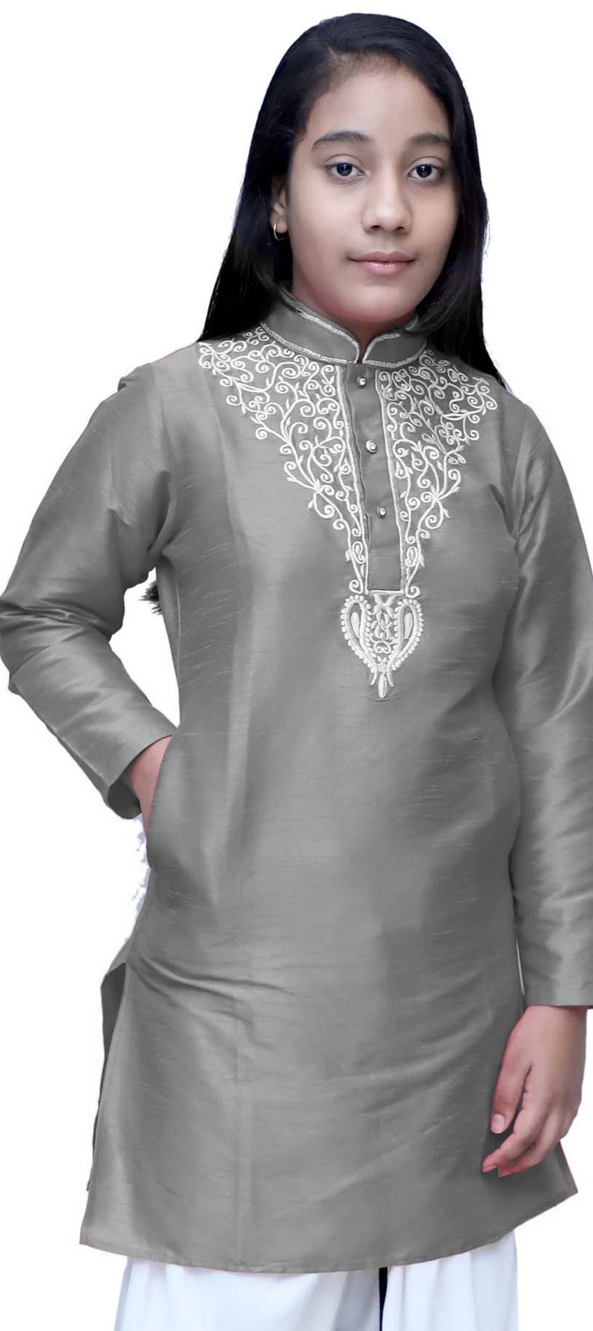 Dupion Silk Girls Dress In Black And Grey With Embroidered Work