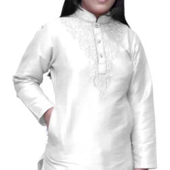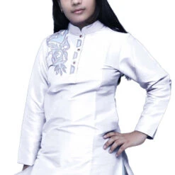 Dupion Silk Girls Dress In White And Off White With Thread Work