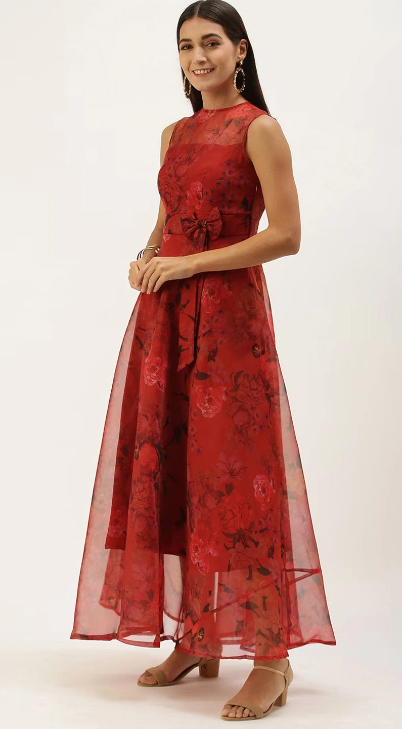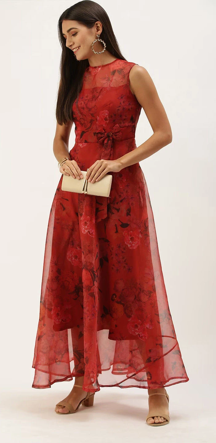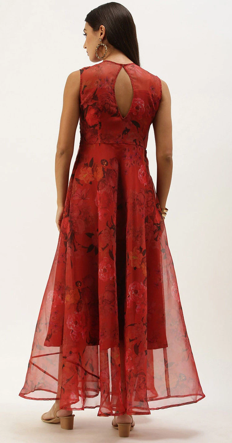 Red and Maroon color Dress in Organza Silk fabric with Floral, Printed work