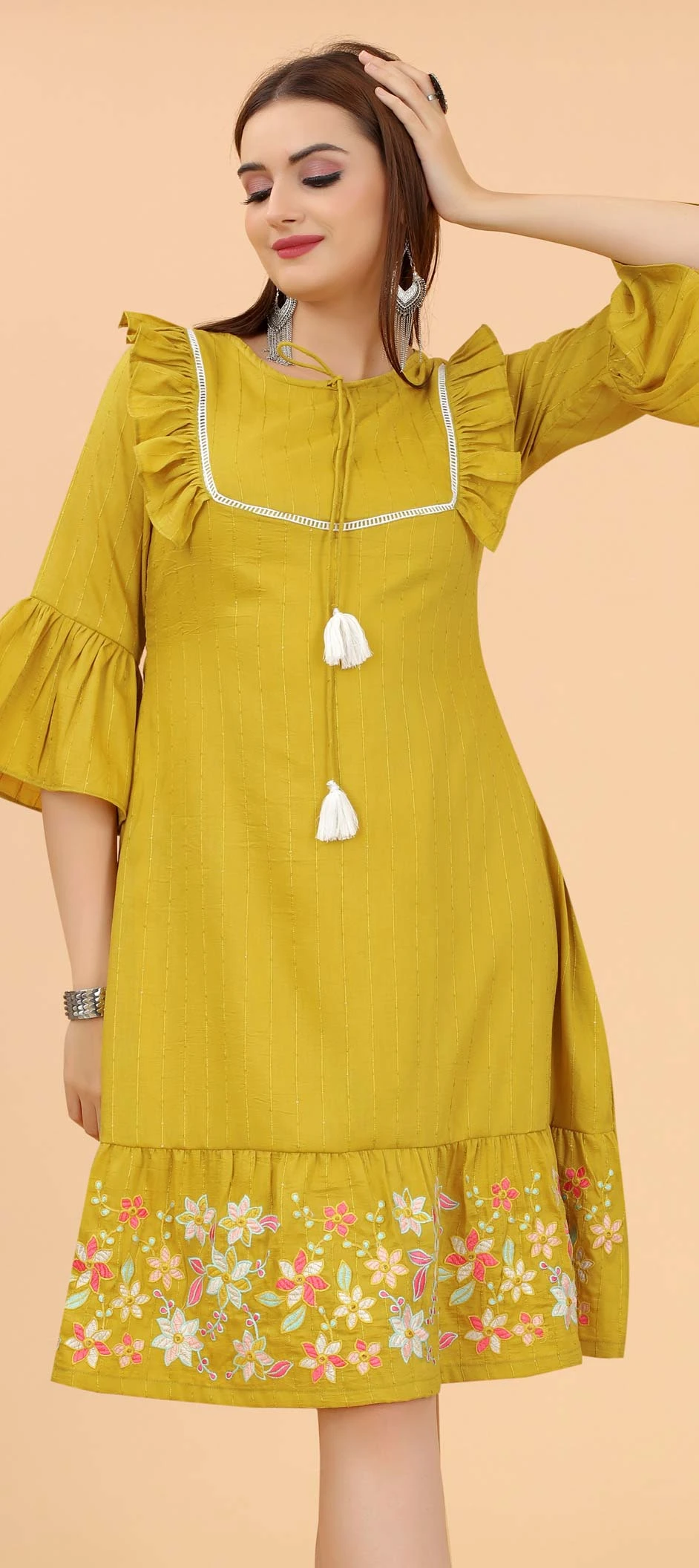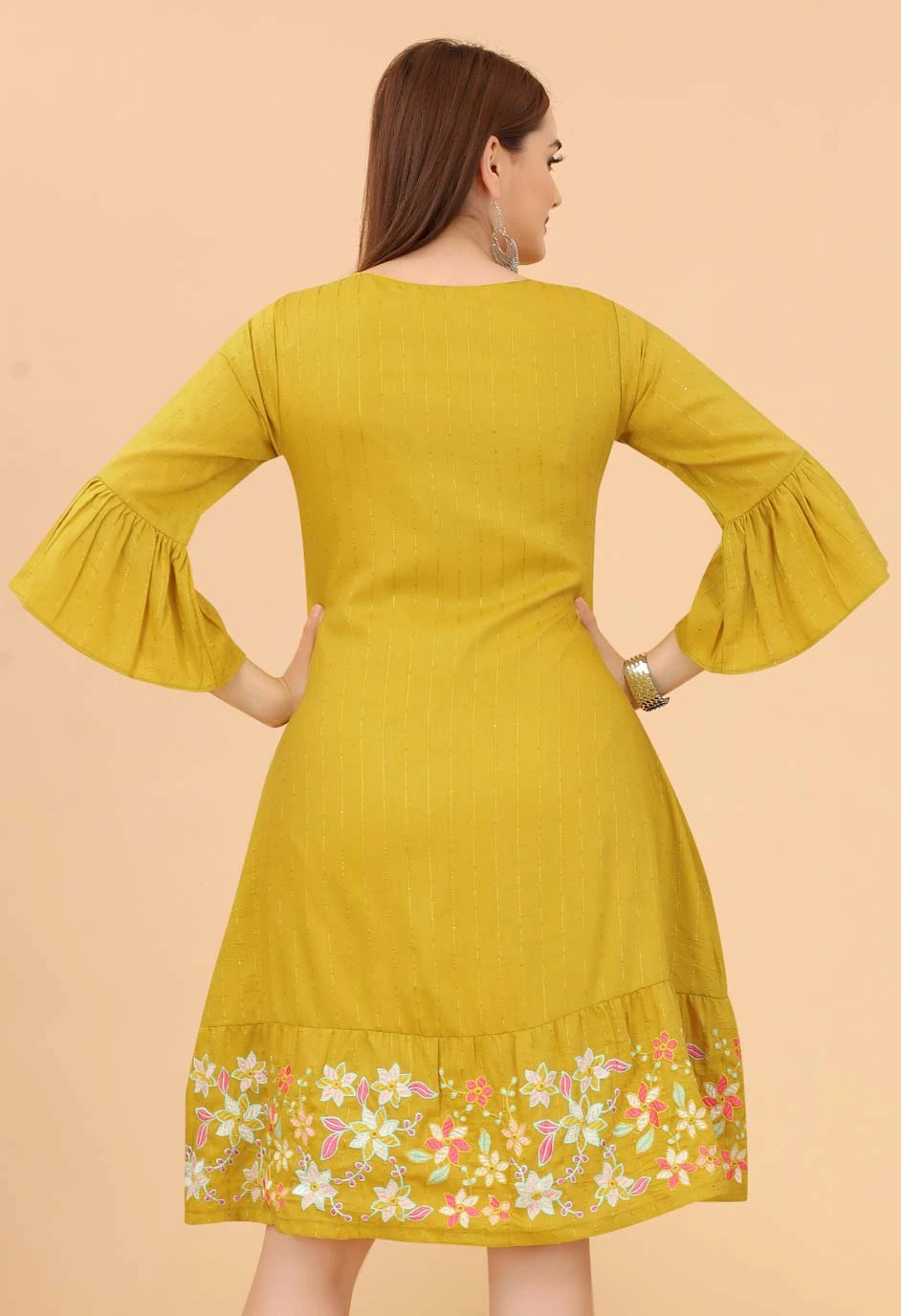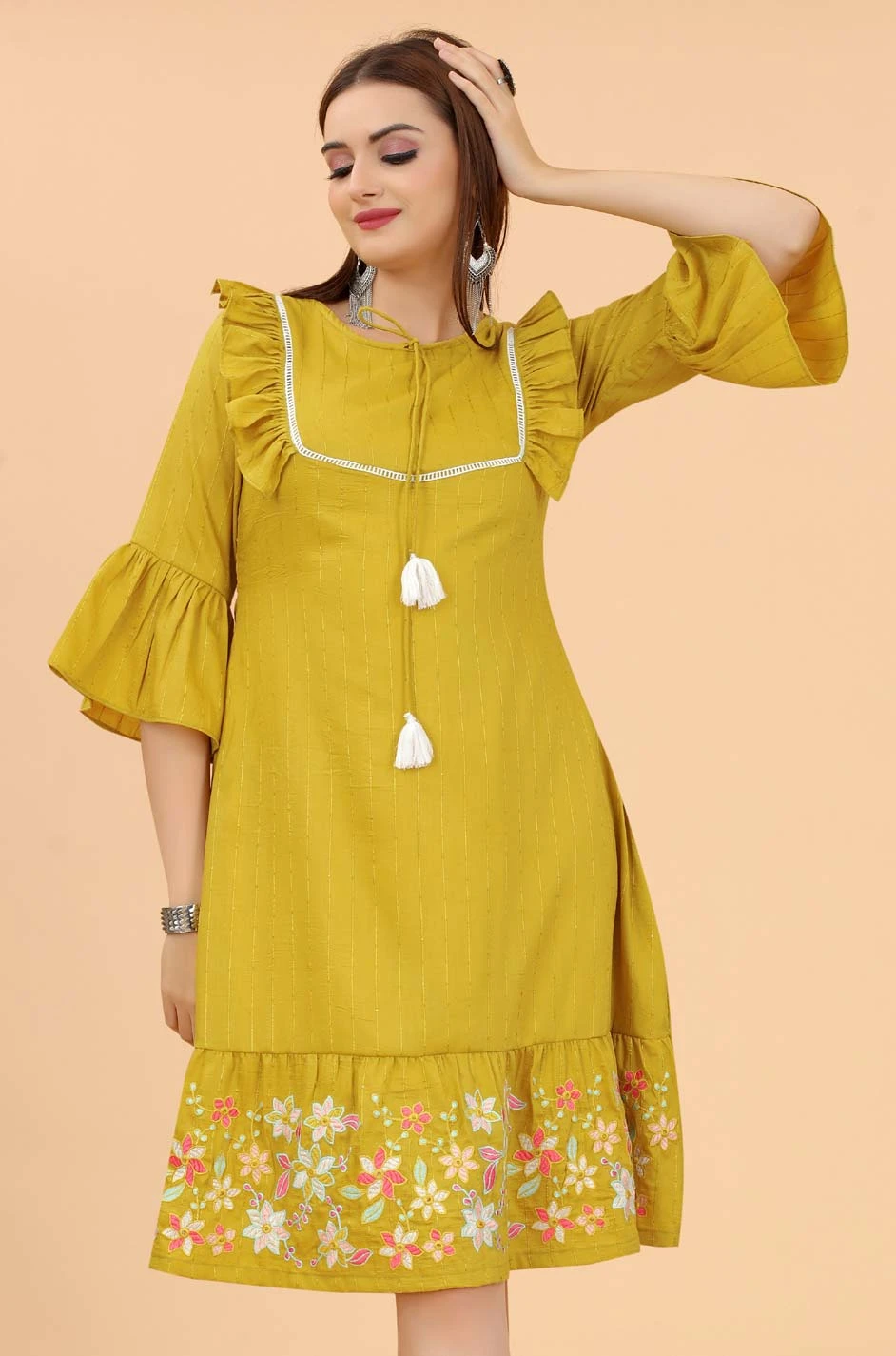 Yellow color Dress in Rayon fabric with Embroidered, Resham, Thread work